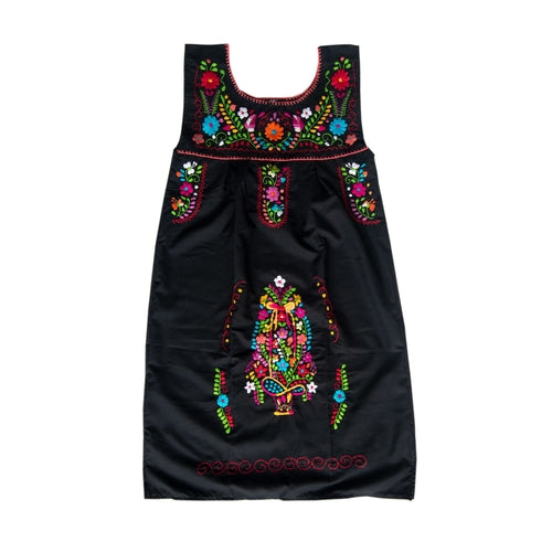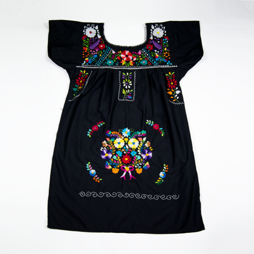 Enjoy this original and super comfortable black dress that has all the cheerfulness of colorful flowers and all the delicacy of hand embroidery work behind.