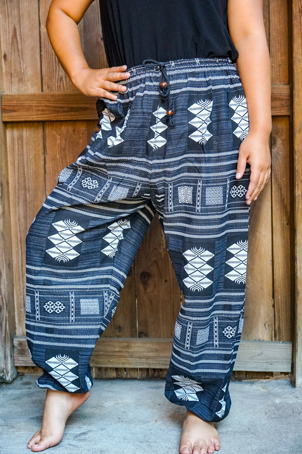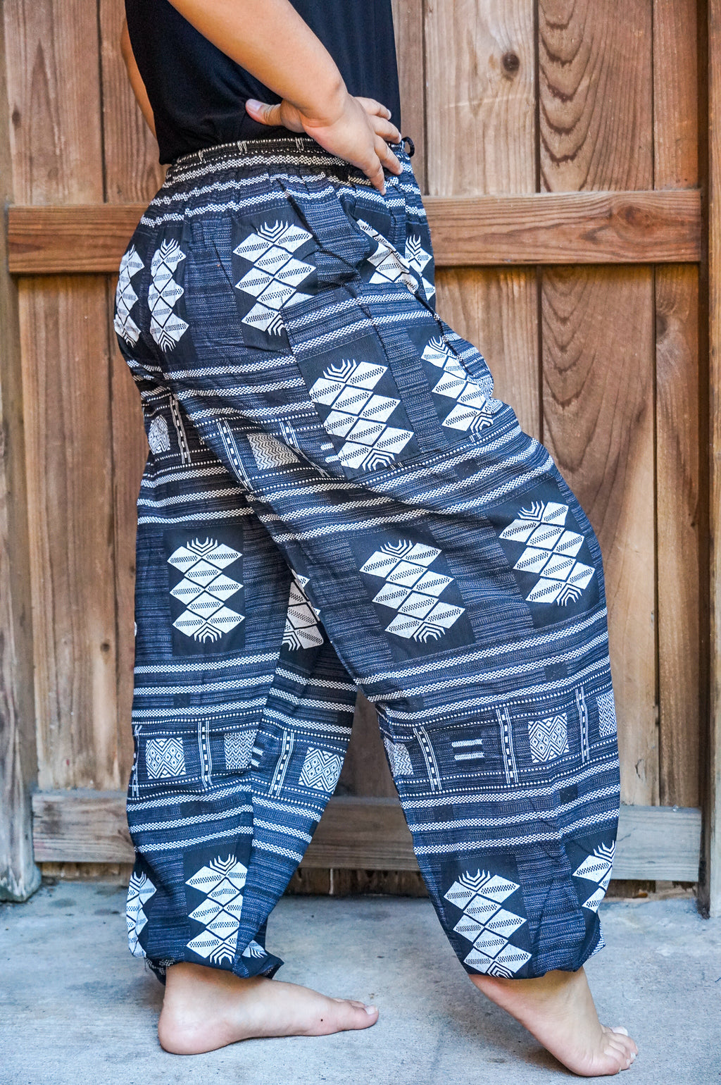 Loose and supremely comfortable cotton Pants. They are unisex and have an elastic drawstring waist and elastic ankles for a flexible fit. Standard one size fits most (US size 0-16 or XS-L). Our harem pants are handmade with soft and comfortable cotton, perfect for both cooler and warmer weather. The pants will make you look very chic and boho. These pants are great for exercise, yoga, taking a walk in nature or the beach, festivals, family get together, or just relaxing at your home.