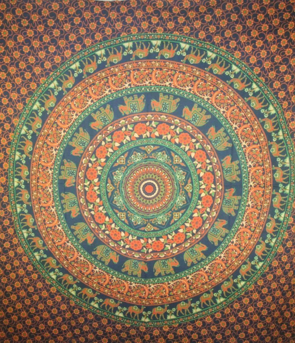 A kaleidoscopic view with circles and circles of tremendous color power spiraling from a beautiful center flower. This tapestry features designs of animals like elephants and camels and pretty floral prints all available in this array of color combinations!