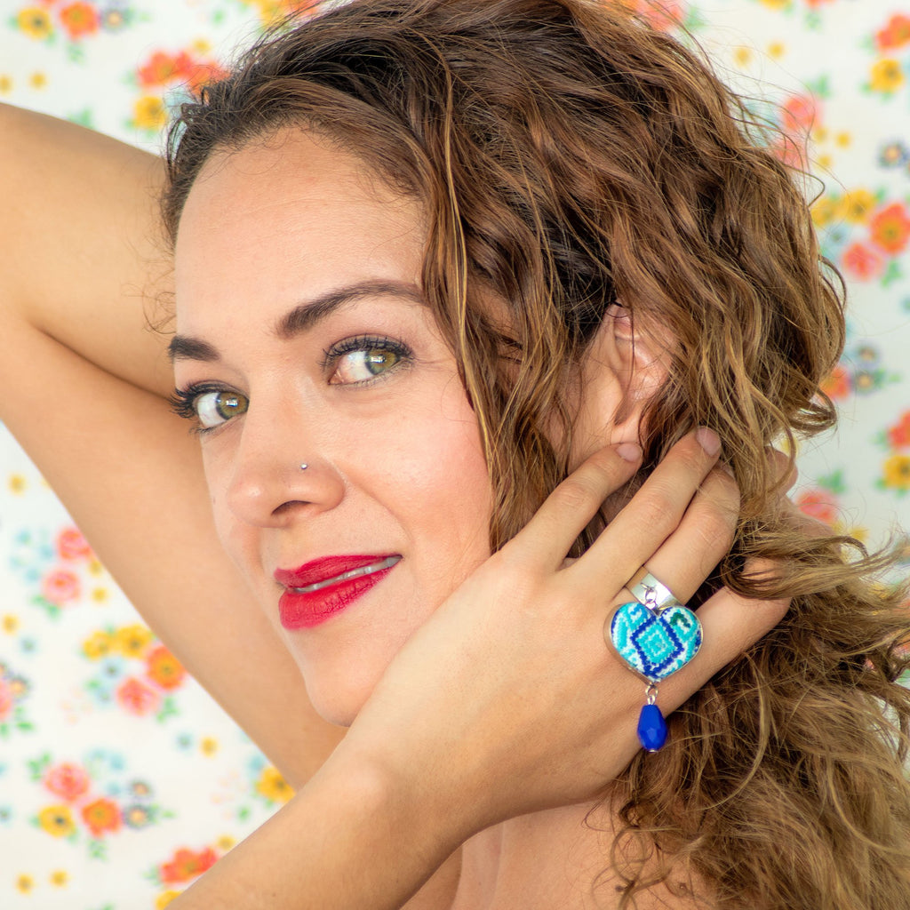 🌵Adjustable ring with embroidered heart pendant and hanging bead made in the State of Chiapas, Mexico.