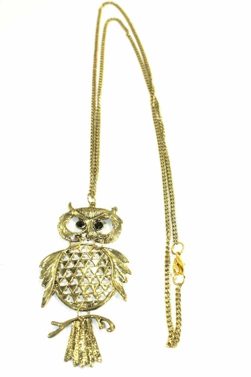 Popular for their big mystical eyes, this necklace displays a cute owl perched on a branch designed with an open work style for its belly and is available in antique gold tone and hematite tone, that can be accessorized with any look, day or evening!
